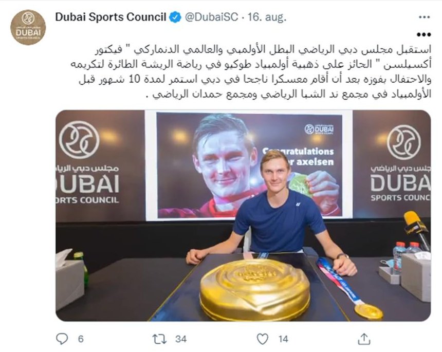 Viktor Axelsen er ikke BLOT flyttet til et sharia-regime. Han er også aktiv i regimets PR propaganda. Se denne video fra 16.8.2021, hentet fra Twitter, hvor Dubai Sports Council endda lyver og tager en del af æren af Viktors OL guld.